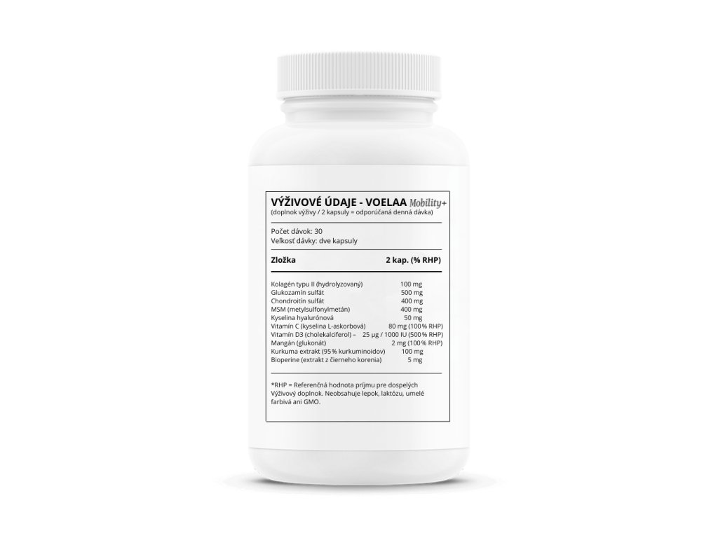 Voelaa Mobility+ je pokročilý doplnok navrhnutý pre zdravie kĺbov, pohyblivosť a celkovú regeneráciu. Obsahuje overené látky ako kolagén, glukozamín, MSM a protizápalové antioxidanty ako kurkuma či vitamín C. Vhodný pre športovcov, fyzicky aktívnych aj seniorov.